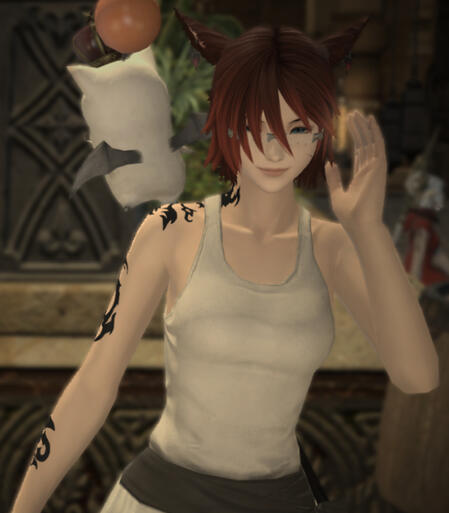 Gallery: https://imgur.com/a/o8zNWePSam is a late twenties soft frisky gal from Coeurl, as all cats should be. She will have a hard time staying in one spot, or in one occupation for too long. She has tried adventuring with a blunt axe, carpenting, racing chocobos and is currently exploring her weird feelings about working as a street dancer, of all things, in her own little world.She will try everything once and just be an unbearable friendly company, always paying in kind. Her nature can be a tad shy, either at times, or with certain people. Sam can be found just about anywhere, usually in casual attires. Chances are she will indulge anyone that asks nicely, for a chat or some murdering.She is originally from Gridania, having started as an archer, quickly dropped the exceedingly dull weapon for Limsa smell, and an axe. She took a liking of Ishgard, spending much of her time into in the library, snuggled into warm clothes.Sam tends to be extremely shy towards intimacy, self conscious about her body. She has, as things would be, experienced it all, preferring the company of feminine partners just as much as she adores cute things, knowing full well how adorable she can be. She will, admittedly, be extra clingy and subby towards the ones she loves.In contrast, she has a tough skin and will put up a smile when dealing with annoyances that would make others break into tears. That rough edge can get her into trouble when she ignores others feelings, rolling her eyes towards people "whines", as she would put, ignorantly.She is a very shortsighted - and currently redhead - a blind mess without her glasses. Her appearance is as tall as female miqo'tes get, fit, being unusually strong for her still quite petite size, a bit muscular.